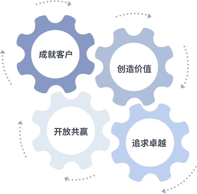 成就客户是一切决策的出发点,,,创造价值是衡量所有工作的标准,,,,追求卓越是我们做事做人的态度,,,,开放共赢是我们的格局也是最终的结果。。。价值观的齿轮环环相扣,,推动着组织里的每个人不断向前。。。。