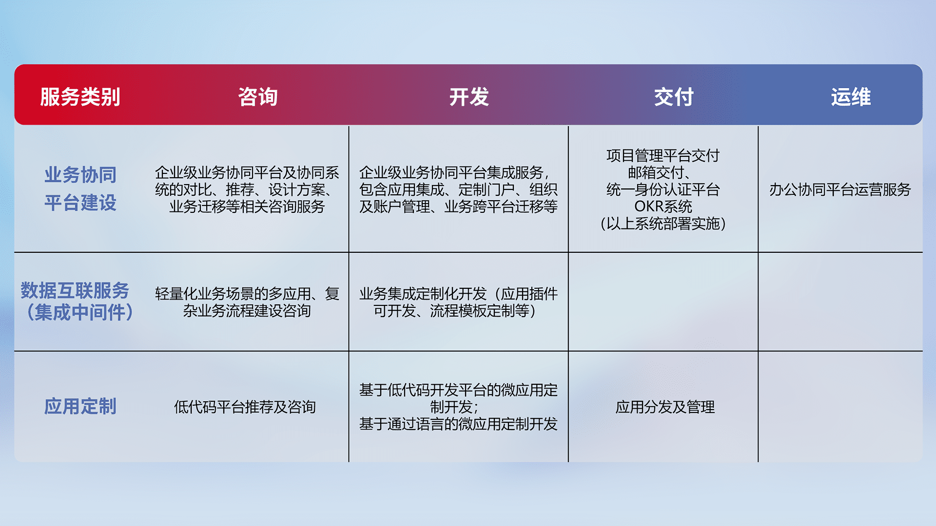针对钉钉、、企微、、IDaas等平台级产品提供产品的规划、、、、方案、、交付、、、定制化开发等服务,,,,实现如统一协同办公、、、、智能客户服务、、、混合会议管理、、、智能数据查询、、、、等业务场景,,,实现数字化转型。。。