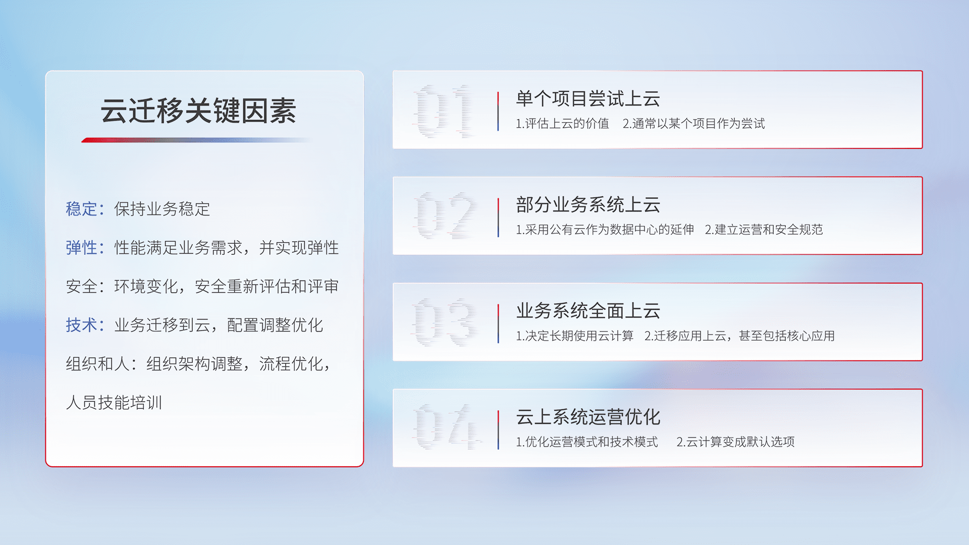 结合实际业务,,,,从规划设计、、、云平台选型、、、、云原生改造、、、、数据迁移、、、、集成交付,,,迁移全过程为客户识别最佳上云路径,,,做好风险识别管理,,设计网络架构、、、、身份权限、、、安全审计合规、、、、操作审计、、、日志审计、、、监控告警策略、、、、多站点容灾设计等,,,对云上基础设施进行整体规划,,,,提升IT治理水平,,,以满足弹性、、高可用、、高性能的需求。。