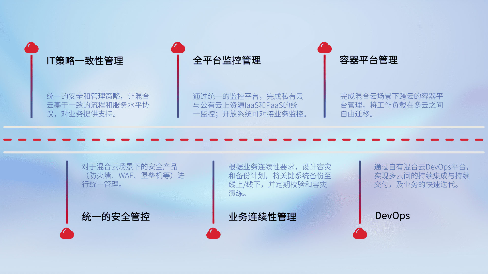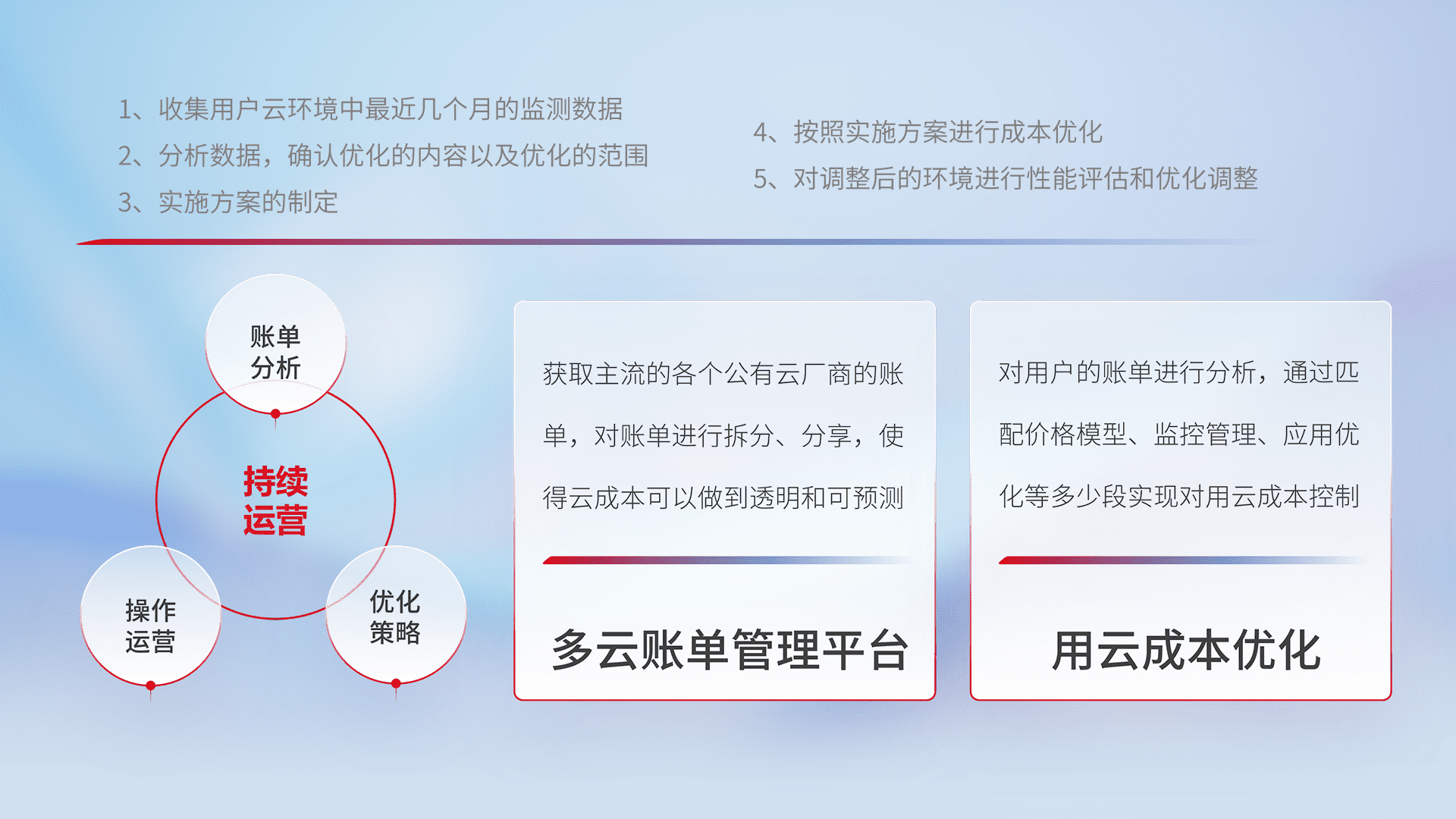 通过多云纳管,,以统一的资源数据模型把客户的云资源进行抽象和封装,,,进而实现对多云资源的统一操作,,,保障云资源管理的可靠性、、稳定性与可用性。。量身定制化运维内容,,配置、、、开发运维、、、、补丁管理、、、、备份、、、监控、、认证和访问管理、、审计和日常巡检等,,保障在用云过程中的可靠度,,,,稳定度以及高可用率。。