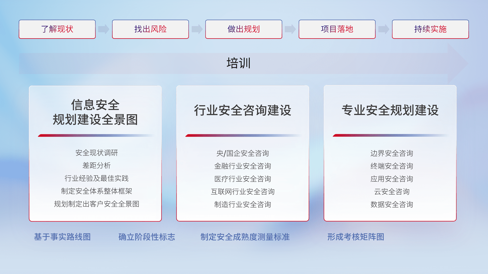 梳理客户信息安全现状调研、、差距分析结果,,结合行业先进经验及最佳实践,,制订客户的信息安全管控体系总结架构,,最终形成一个完整的客户信息安全规划与建设的全景图。。