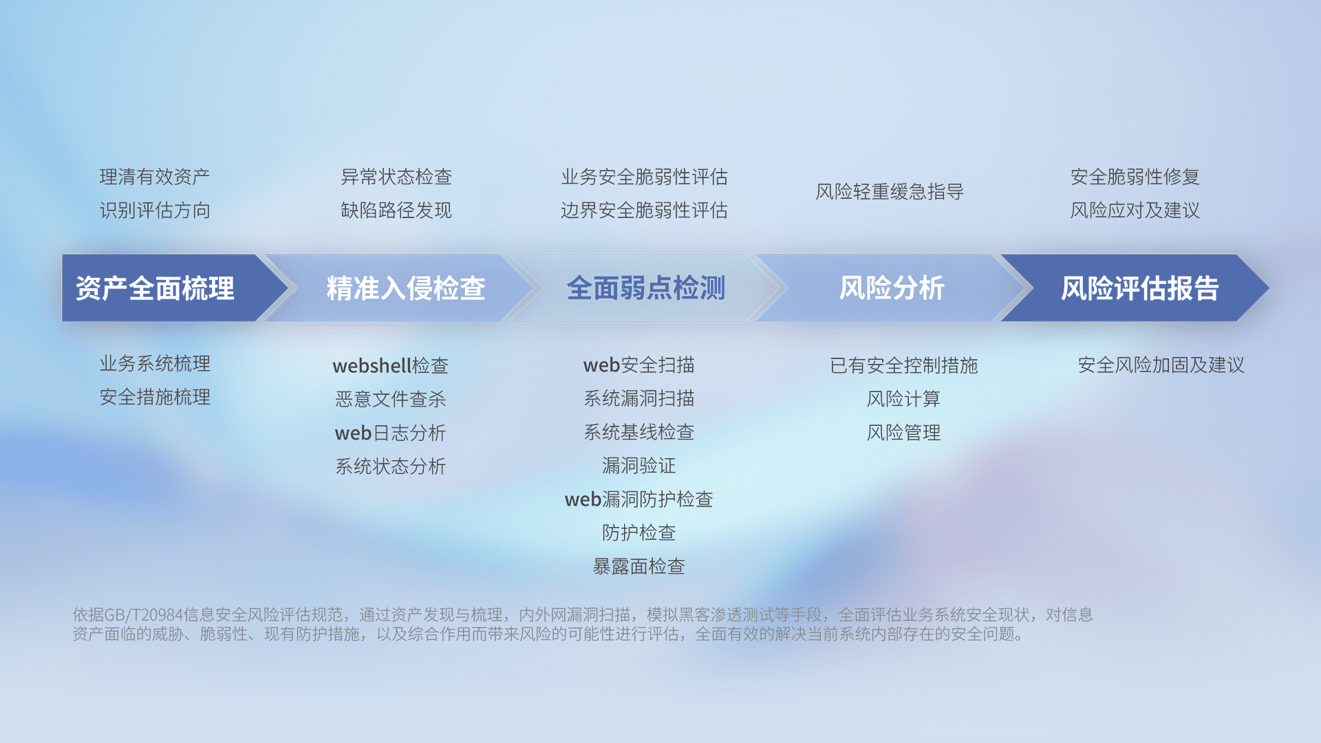针对客户行业特性,,,,以专业的安全服务+多厂商联合解决方案提供专属的一站式安全管理服务,,,帮助客户全面感知网络空间威胁,,基于识别、、、检测、、、分析、、、、防护、、、、监测、、响应的服务理论模型,,从方案咨询、、、、集成交付、、、评估验证、、优化加固、、、、运维运营,,,,致力于为客户提供完整的闭环管理式安全服务。。。以实战经验为客户打造高抵御风险的安全体系,,帮助客户发现威胁、、、对抗威胁、、处置威胁,,,不断积累安全对抗能力,,,持续保障数字化安全。。